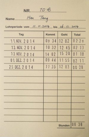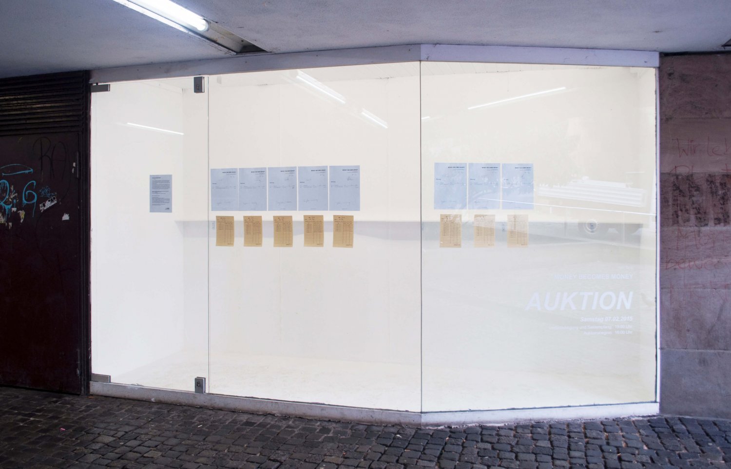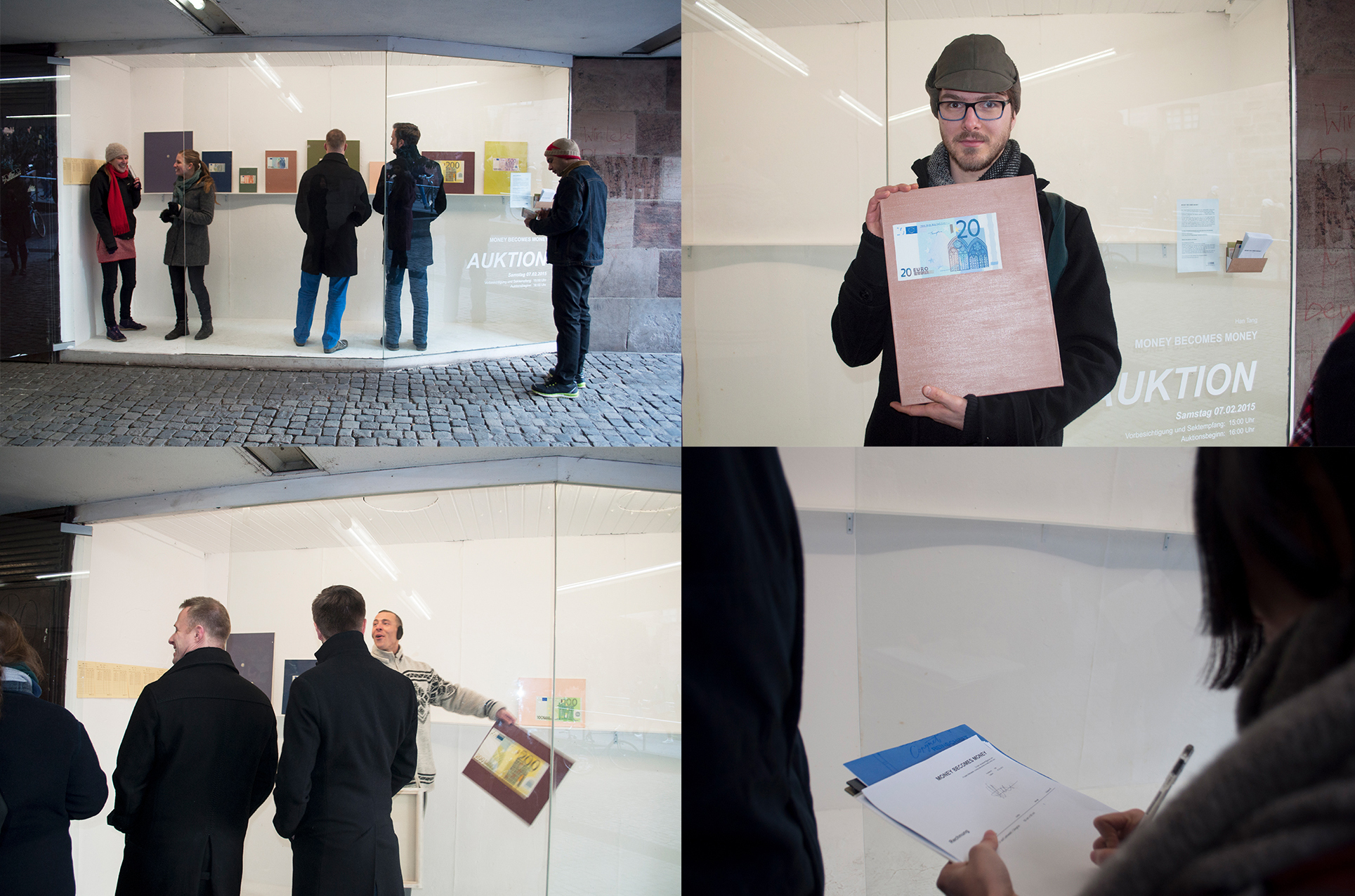 I painted eight different denominations of euro banknotes in oil and used a punch-card to record the working hours of each painting. These were then displayed in Vitrine space, which looked like a show window and was next to the exit of the main train station in Nuremberg. What interested me in this project was how “money” can become money, or how to turn the image of currency into actual currency. So, I invited an auction house in the city to perform an auction. The auctioneer auctioned the eight oil paintings in the public space using the typical auction bidding process: the price started from zero and the highest bidder got the work. Of course, what happened in this auction was that the auction proceeds were not equal to the euro face value, which were shown in the paintings, nor were they equal to the time of my labor. At the end of the auction, the bill of the sold work and the punch-cards were also displayed in the show window. I was trying to provide a possibility to calculate the value of these paintings and rethinking about the relationship between working time and the value of the work itself.